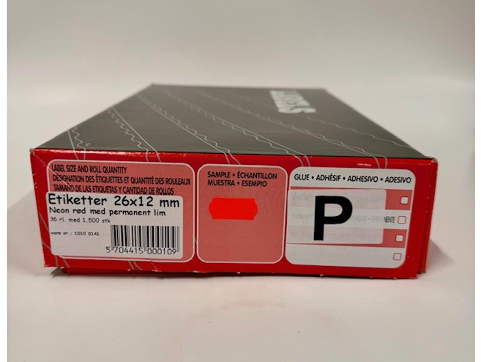 Neon røde prismærker 26x12mm med permanent lim. Der er 36 ruller á 1.500 etiketter pr. kasse