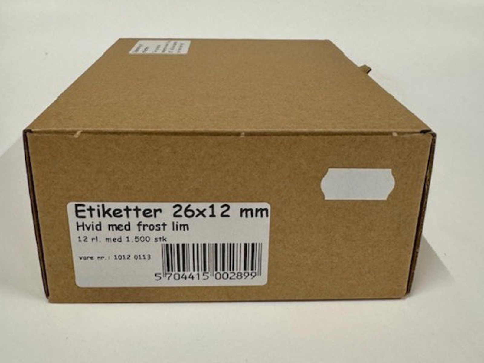 Hvide prismærker 26x12mm med FROSTLIM. 12 rl á 1.500 etiketter pr æske.