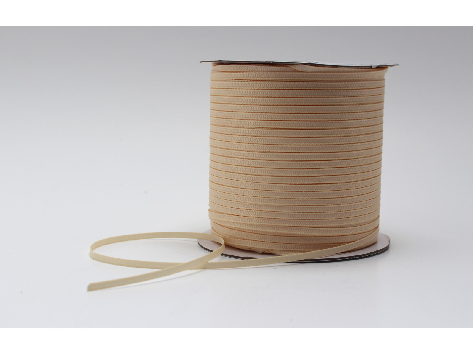 Cremefarvet silkebånd 3mm bredt i rillet kvalitet. 325 meter pr. rulle