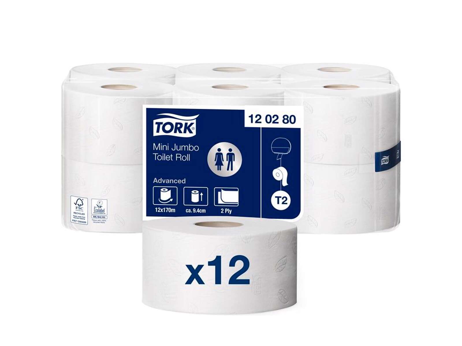 TORK T2 toiletpapir 12 02 80 er lavet af 100% genbrugspapir. Der er 12 ruller pr. pakke og papiret er Svanemærket.