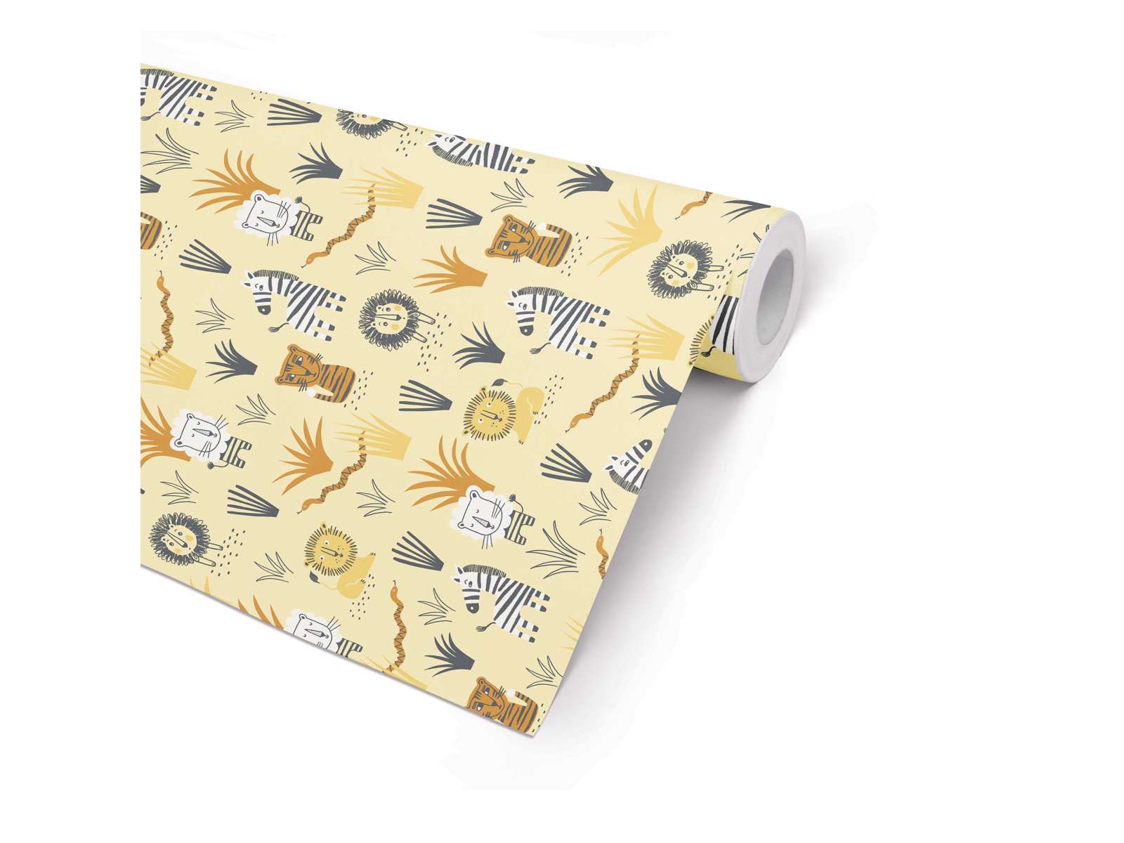 Gavepapir til børn med lysegul baggrund og masser af vilde dyr.
