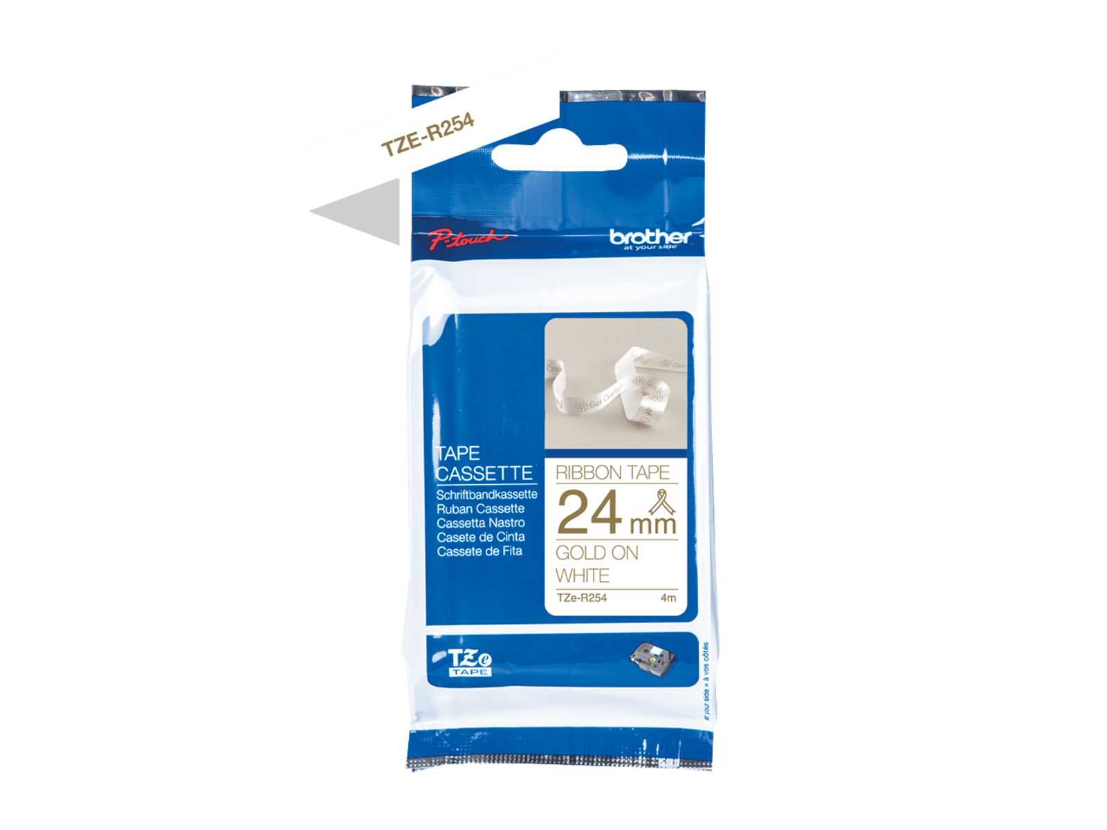 Brothers originale TZe-R254 satinbånd i guld på hvid er 24 mm bredt og af høj kvalitet.
