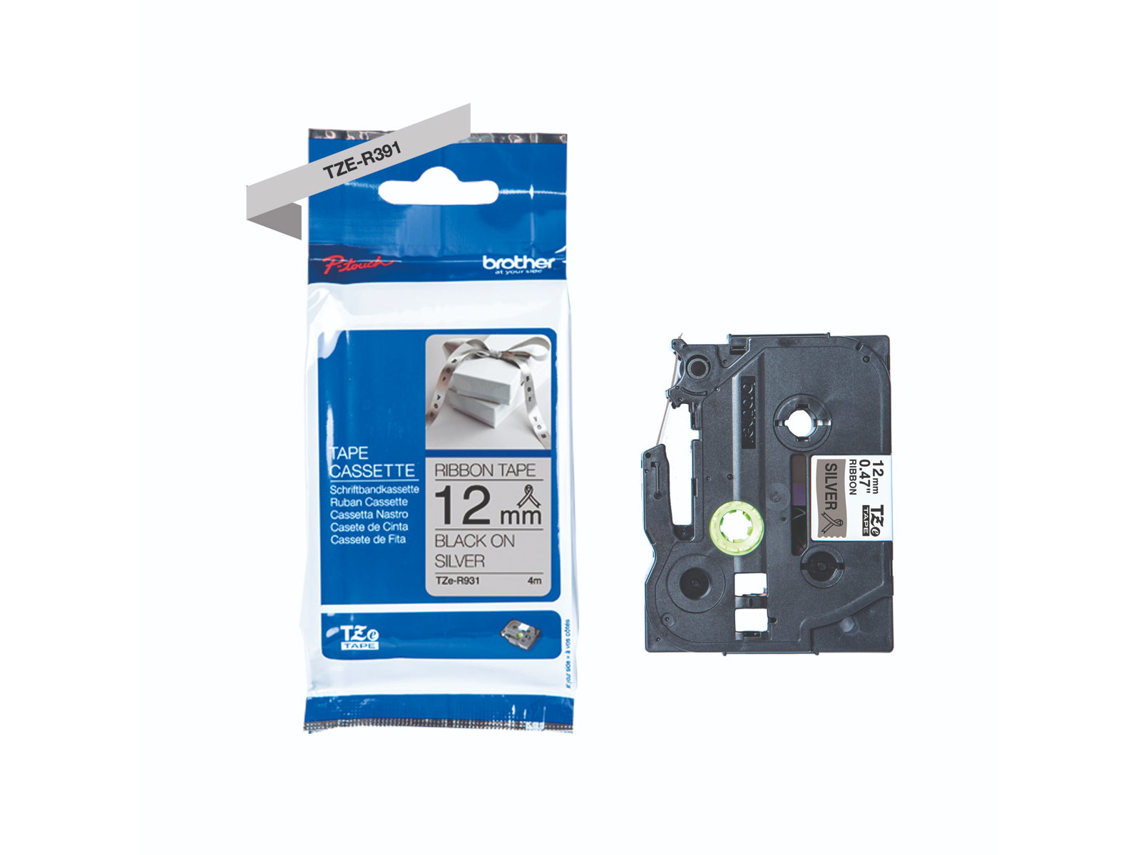 TZe-R931 printer sort tekst på sølv 12mm satinbånd af 4m længde, kan bruges som gavebånd