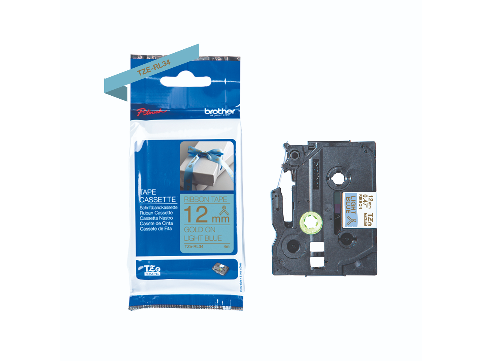 TZe-RL34 printer guld tekst på lyseblå 12m satin bånd af 4m længde, bruges som gavebånd