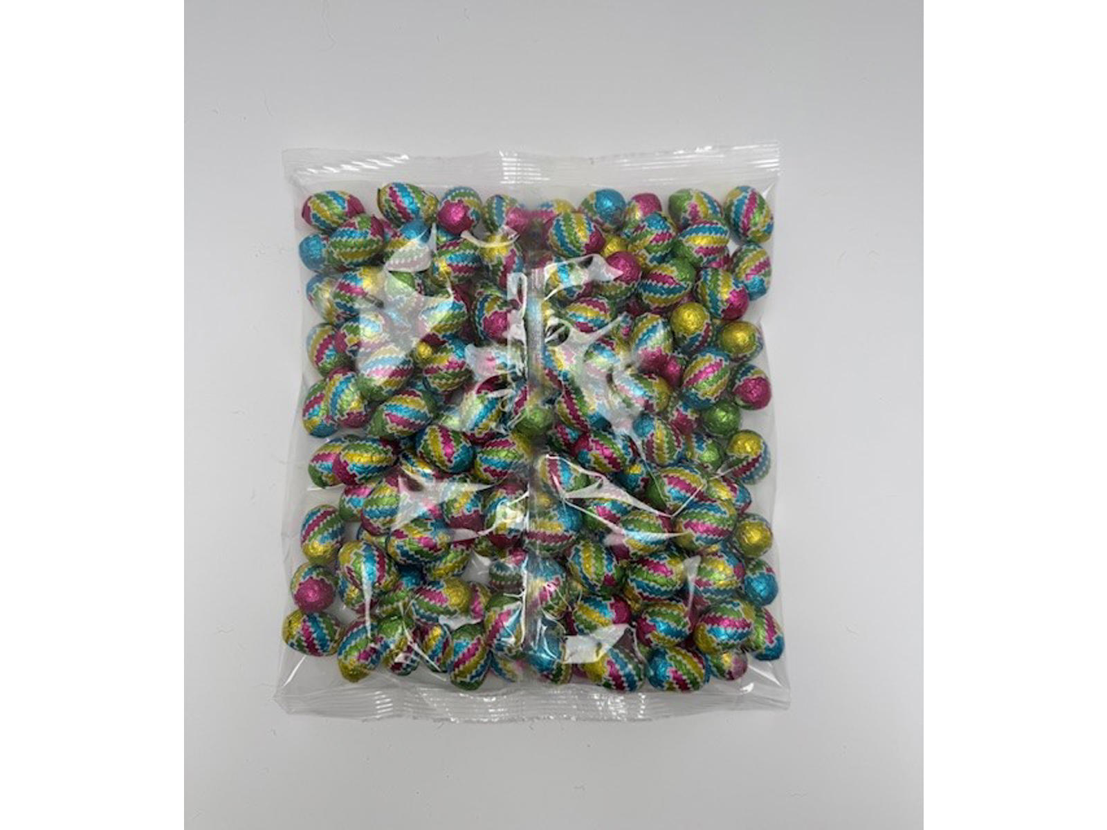 Lækre små chokolade påskeæg pakket i blank farvestrålende stanniol. Brug chokolade æggene i en gavekurv eller som en "tak for ordren" - gave ved påske.