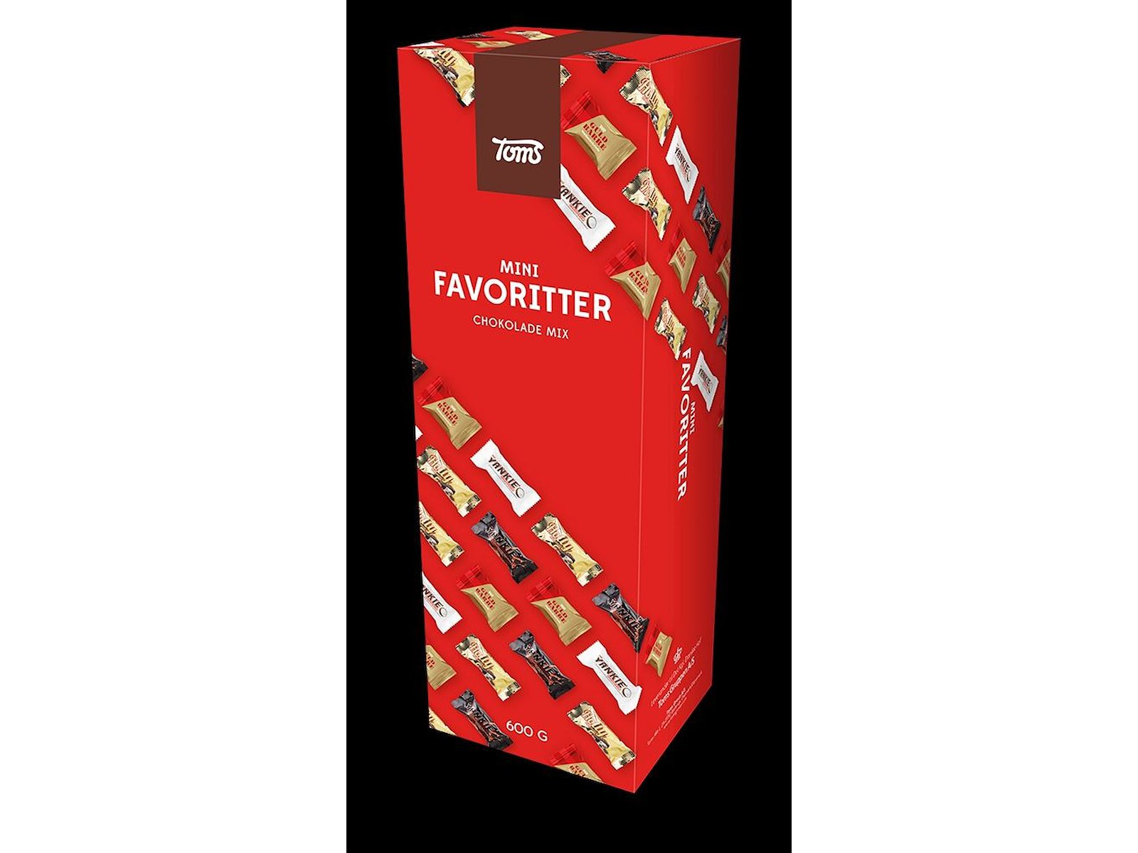 Toms mini favoritter har 600 gram blandede chokolader i en æske. Her får du en skøn blanding af guld barrer, yankiebar og holly bar