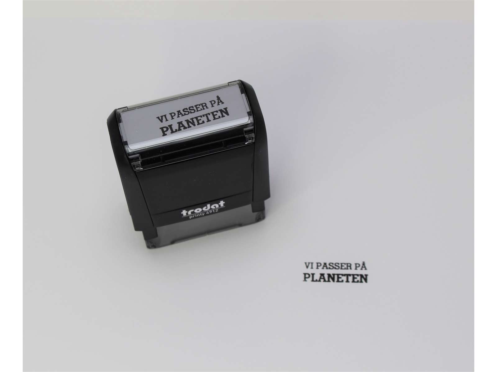 Send en hilsen til dine kunder med dette stempel "Vi passer på planeten", som kan bruges på al din amballage: papir, silkepapir eller poser. Størrelsen på stemplet er ca. 46x17mm.
