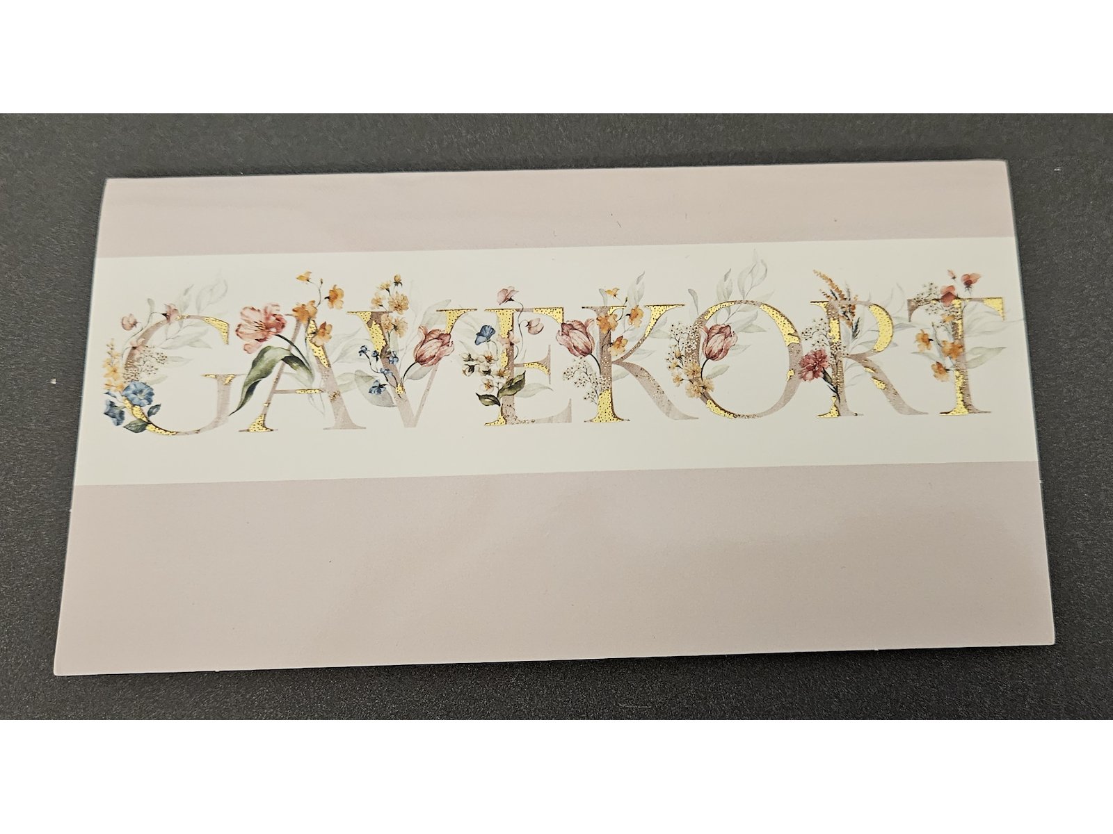 Flot gavekort i gammelrosa med blomster og gulddetaljer
