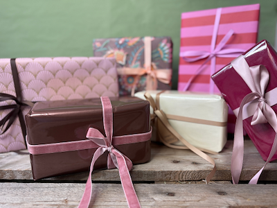 Her finder du alt til gaveindpakningen: gavepapir, silkepapir, bånd, snor og æsker