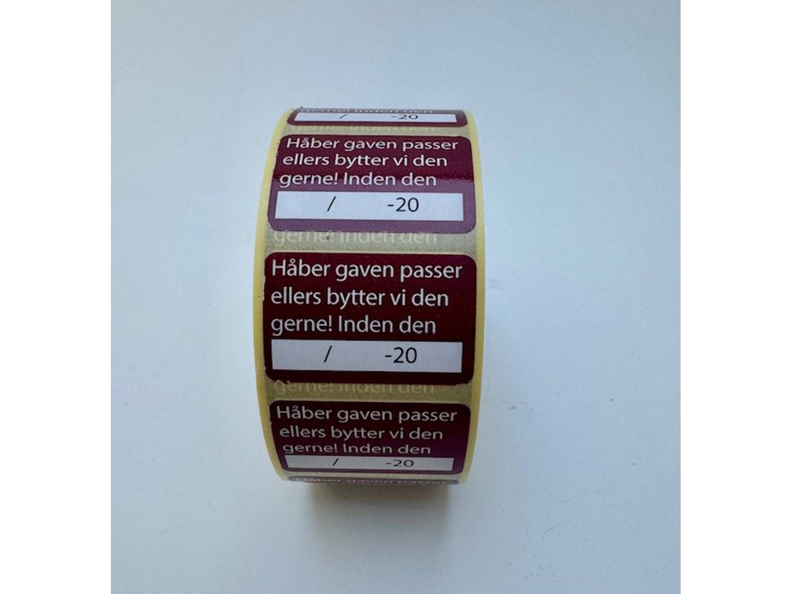 "Håber gaven passer, ellers bytter vi den gerne inden d......" hvor du selv udfylder datoen. Der er 1.000 byttemærker pr. rulle i en flot mørkerød farve