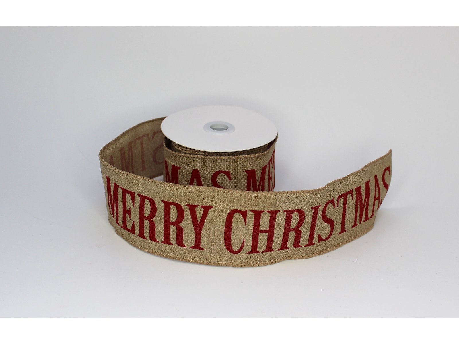 Meget bredt hørbånd i naturfarvet baggrund med rødt tryk Merry Christmas trykt i rødt. Der er ståltråd i kanten af båndet, så man kan lave de flotteste sløjfer. Båndet er genialt, hvis du skal lave en stor sløjfe til dekoration.