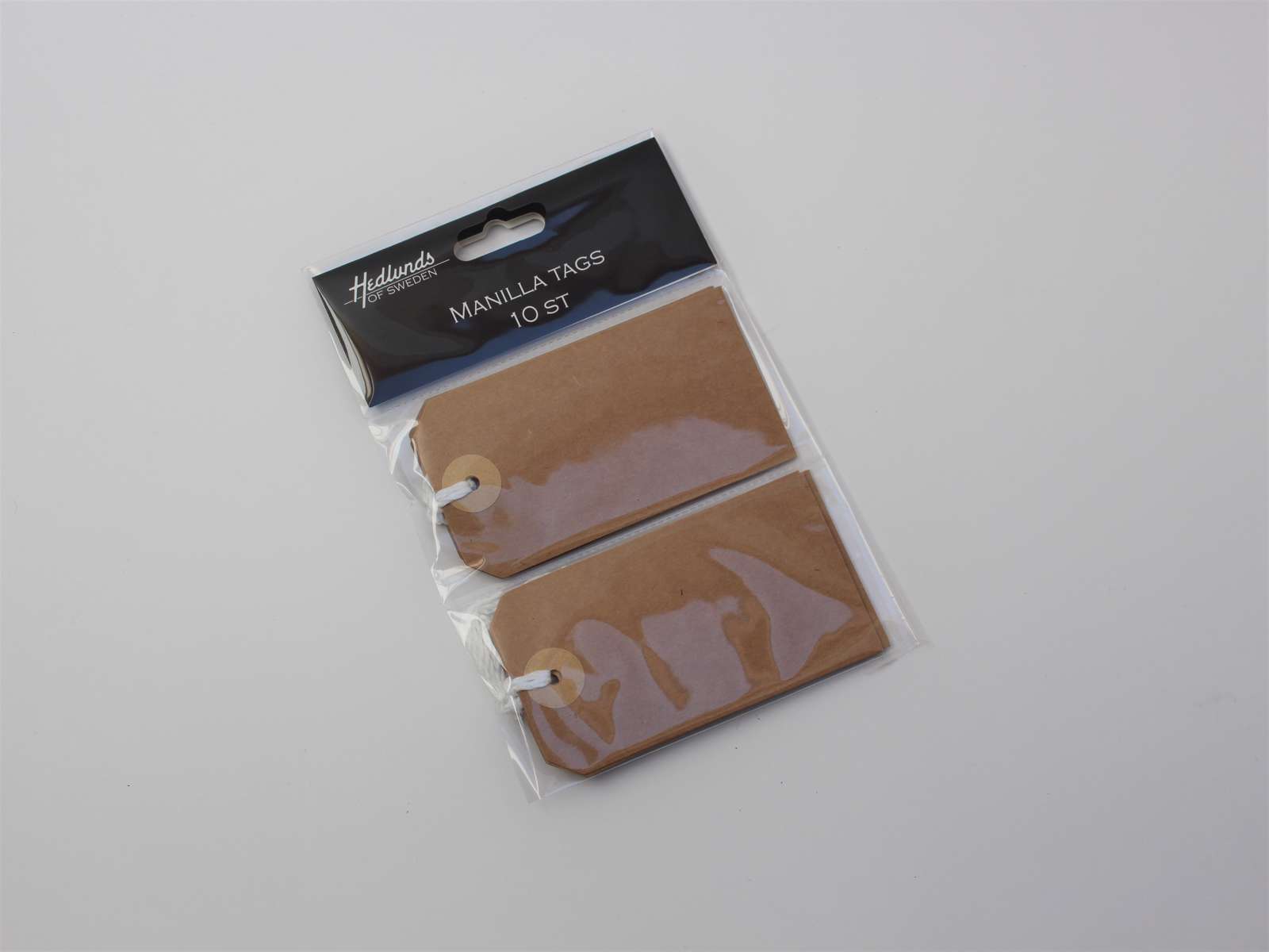 Brune manilla tags størrelse 5x9 cm med snor. OBS! kun 10 stk pr. pakke