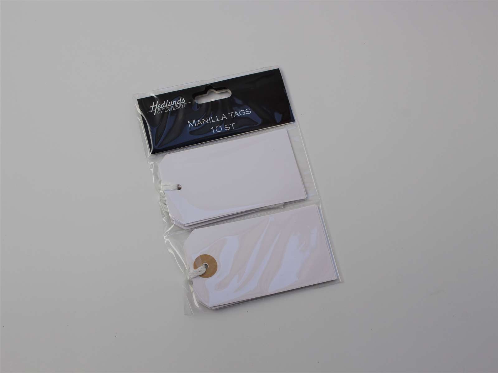 Hvide manilla tags størrelse 5x9 cm med snor. OBS! kun 10 stk pr. pakke