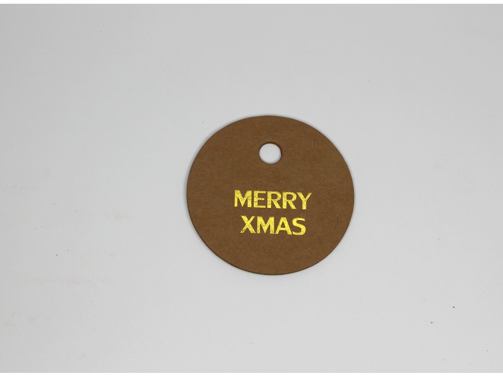 Papmærke rundt Merry Xmas natur m/guld tryk 100 stk