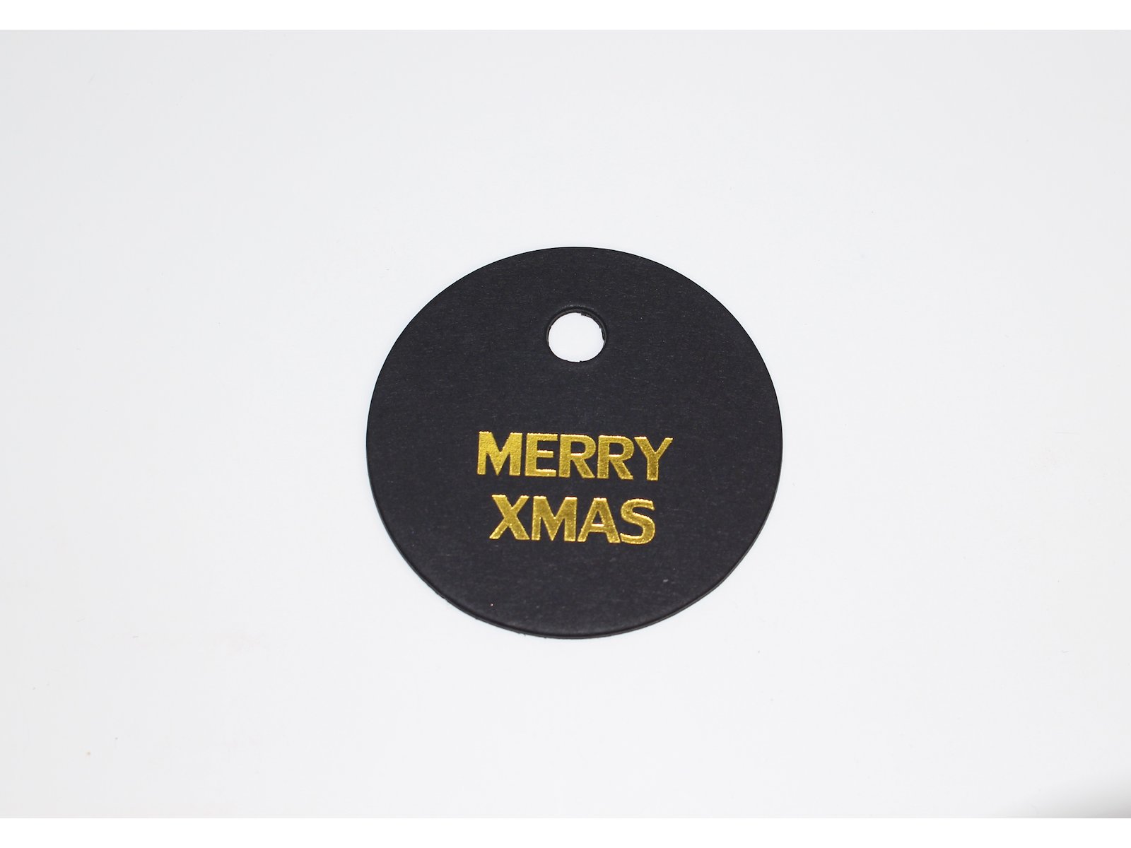 Papmærke rundt Merry Xmas sort m/guld tryk 100 stk