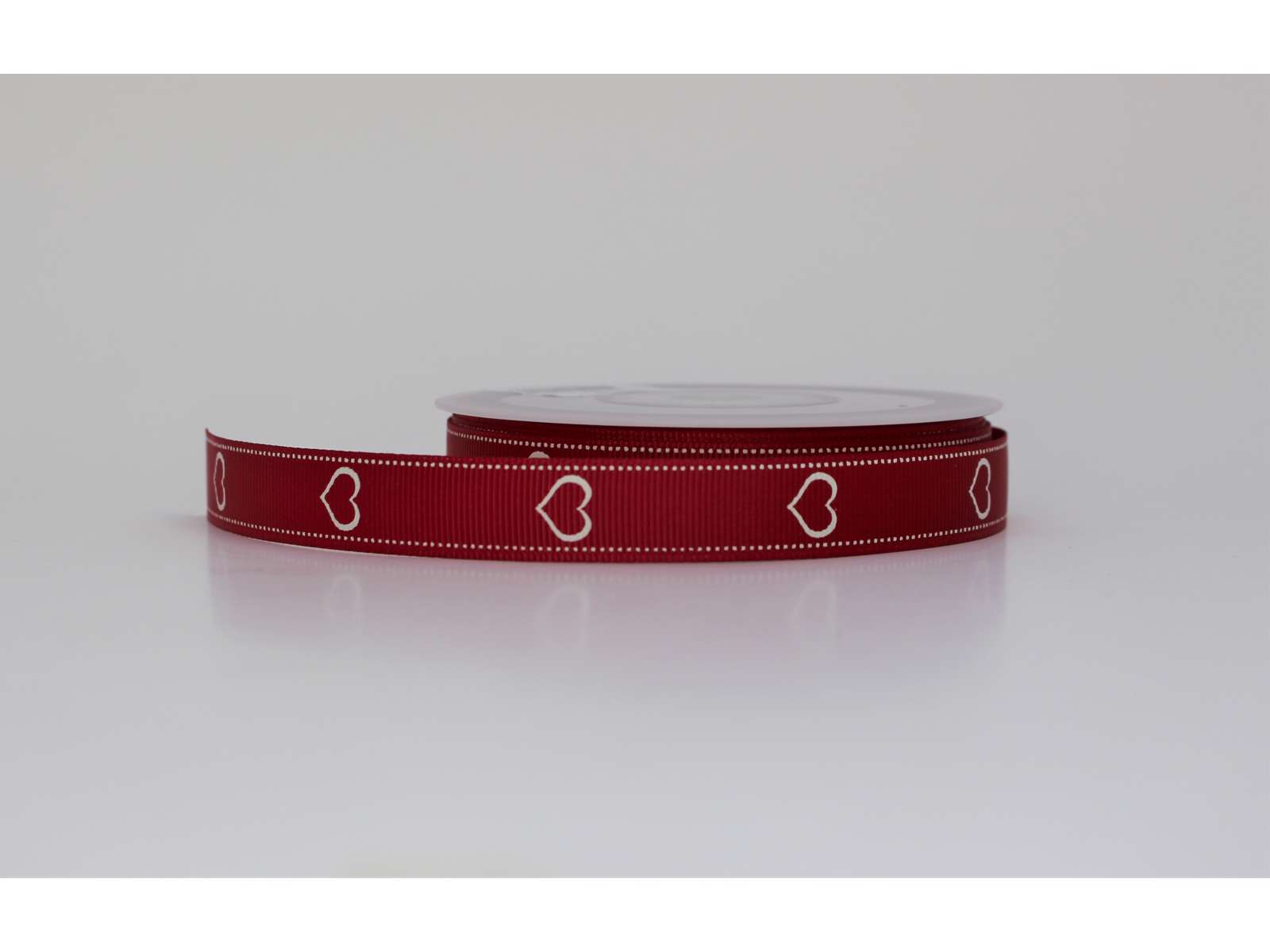 Rødt rillet silkebånd med hvide hjerter. Silkebåndet er 16mm bredt og der er 20 meter pr. rulle