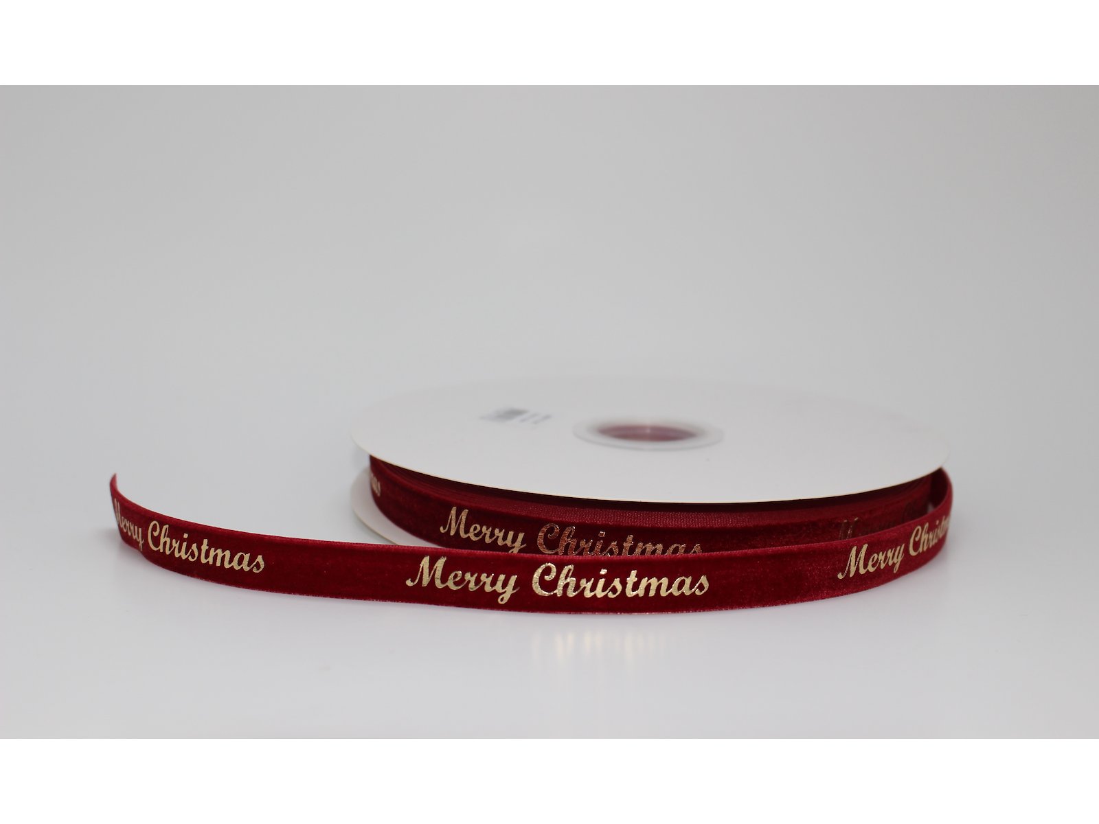 Eksklusivt velourbånd i en flot bordeaux farve med blanke guldbogstaver "Merry Christmas". Båndet er perfekt til at pakke den helt særlige julegave ind, eller til at binde på en cellofanpose.
