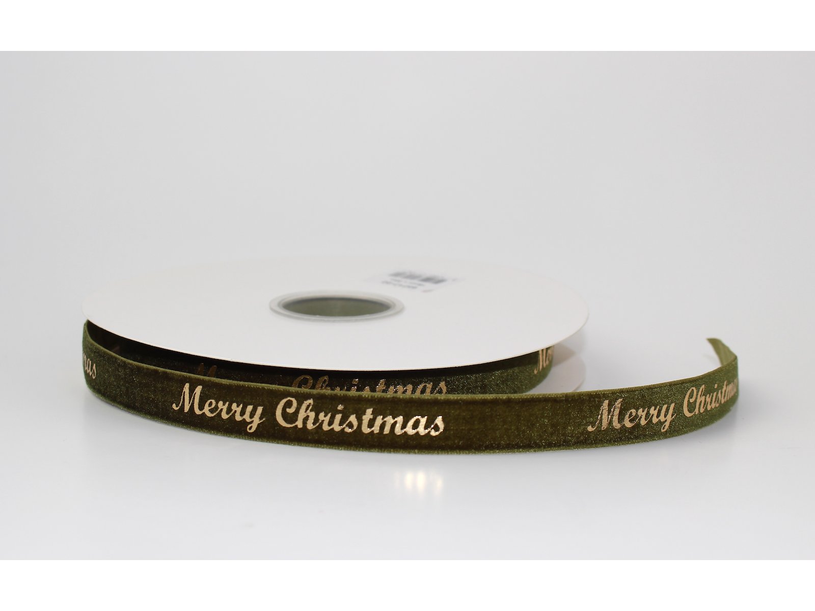 Eksklusivt velourbånd i en flot olivengrøn farve med blanke guldbogstaver "Merry Christmas". Båndet er perfekt til at pakke den helt særlige julegave ind, eller til at binde på en cellofanpose.