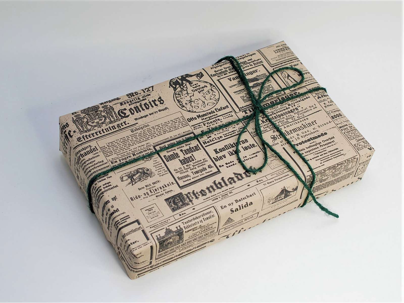 "Gamle tandsæt købes" "Illustreret Tidende" og andre gamle udklip fra aviser er sat sammen til et retro gavepapir.