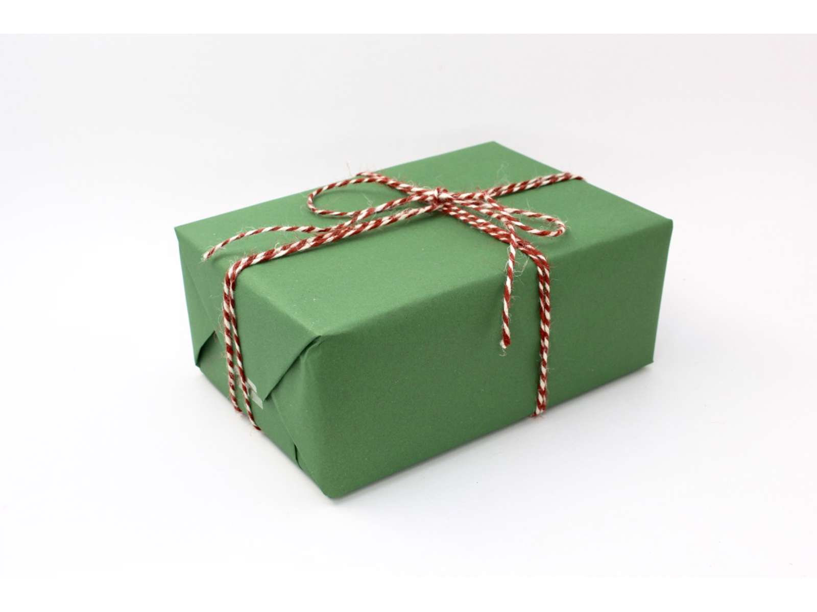 Grønt gavepapir lavet af 100% FSC genbrugspapir.