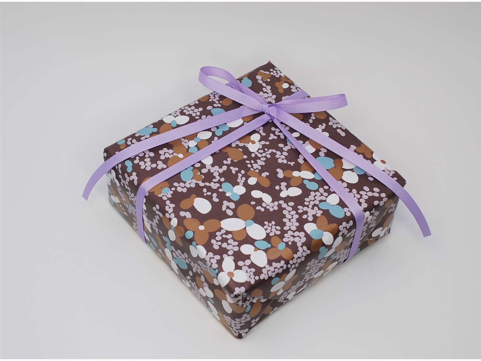 Gavepapir i retrofarver. Brun baggrund med hvide, blå og blanke kobberfarvede blomster. Trykt på FSC mix papir. Bredde 57cm x 154 meter pr. rulle