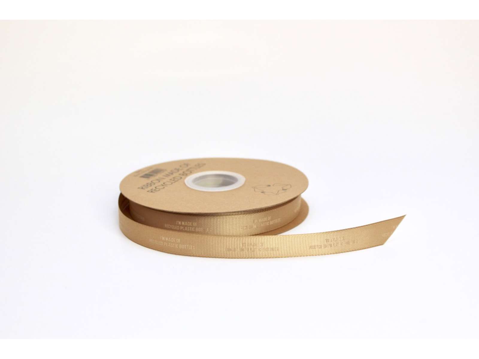 Rulle a 45 meter. 16 mm bredt. Denne farve kan også bruges som guld. Båndet er lavet af genanvendte plasticflasker. Rillet 16mm x 45 meter.