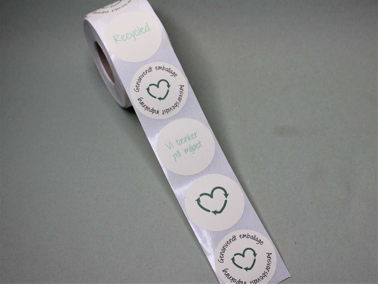 Miljøetiketterne måler 50mm i diameter, og der er 500 etiketter på hver rulle. Etiketterne er trykt på lyst genbrugspapir.