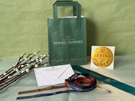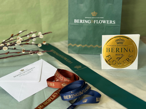 De smukke farver rammer Bering Blomsters logo så smukt ind, og vi er stolte af at have været leverandører af kuverter, gavebånd, kransebånd, etiketter og poser til en kongelig hofleverandør.