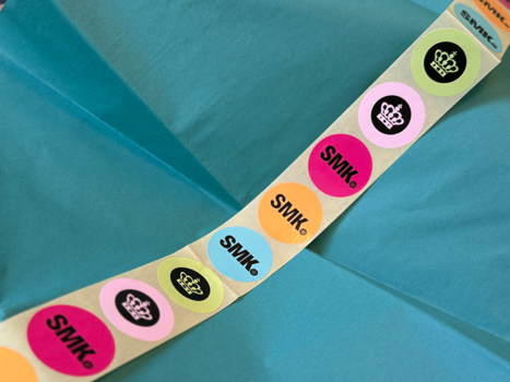 Vi har også leveret gaveposer i SMK's egen blå farve og en række farverige mærkater på en og samme rulle.