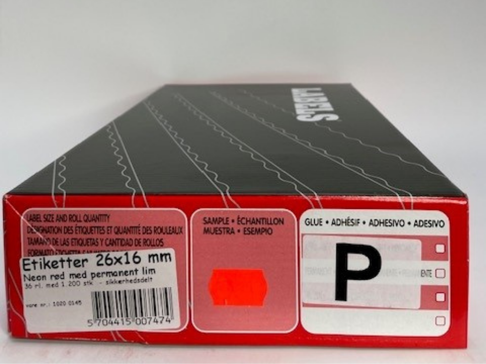 Etiketter 26x16 neon rød m/ permanent lim 36 rl. - sikkerhed delt