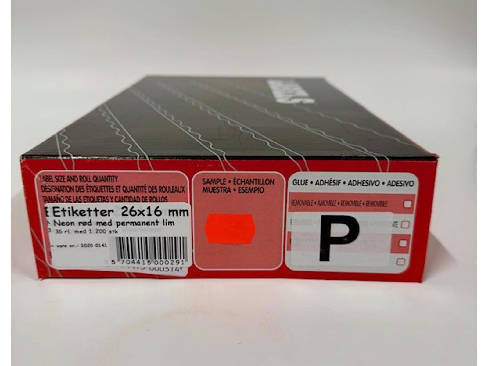 Neon røde etiketter 26x16mm med permanent lim. Der er 36 ruller á 1.200 etiketter i en kasse