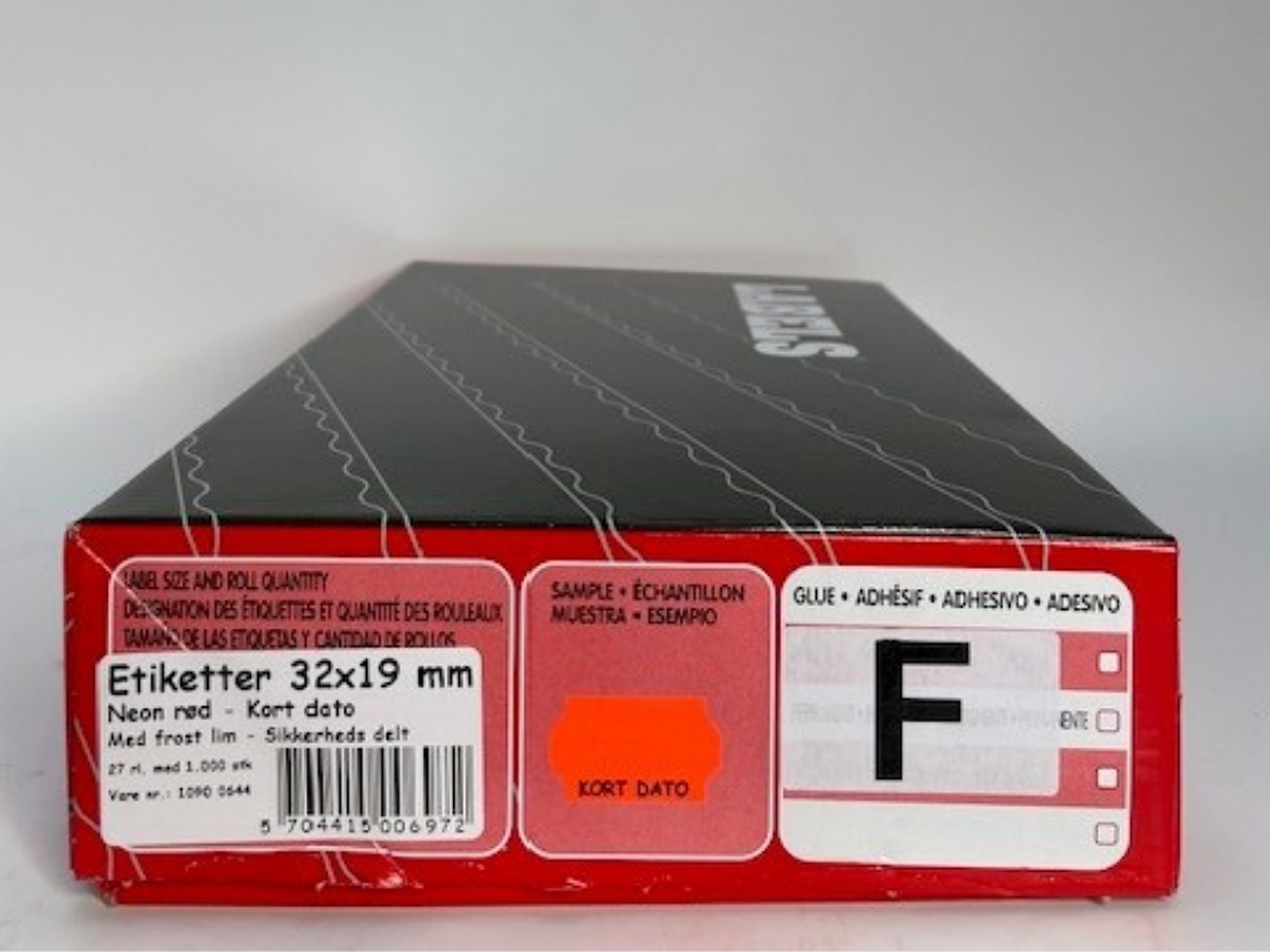 Etiketter 32x19 neon rød Kort Dato - sikkerheds delt - 27 rl. m/ 1.000 stk.