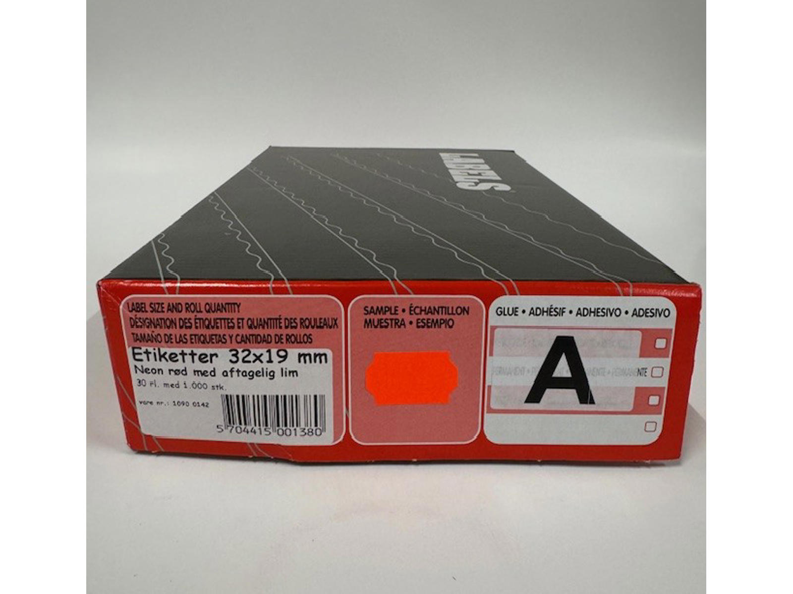 Neon røde etiketter 32x19mm med aftagelig lim. Der er 30 ruller á 1.000 etiketter i en kasse
