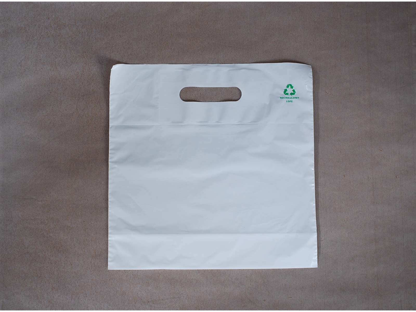 Minimum køb 1000 stk. Der er trykt et genbrugs symbol og teksten "recirkuleret plast" i grønt på den ene side af posen.