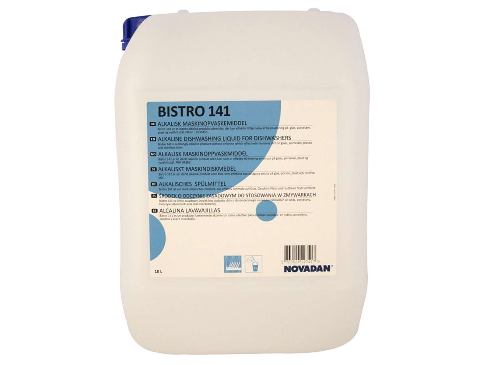 Bistro 141 er velegnet i industrielle opvaskemaskiner med automatiskdoseringsanlæg, og virker effektivt i blødt og mellemhårdt vand. Bistro 141 er et stærkt alkalisk produkt uden klor, der kan effektiv til fjernelse af besmudsning på glas, porcelæn, plast. Bistro 141 rengør effektivt porcelæn og bestik for kaffe & te rester samt proteiner.