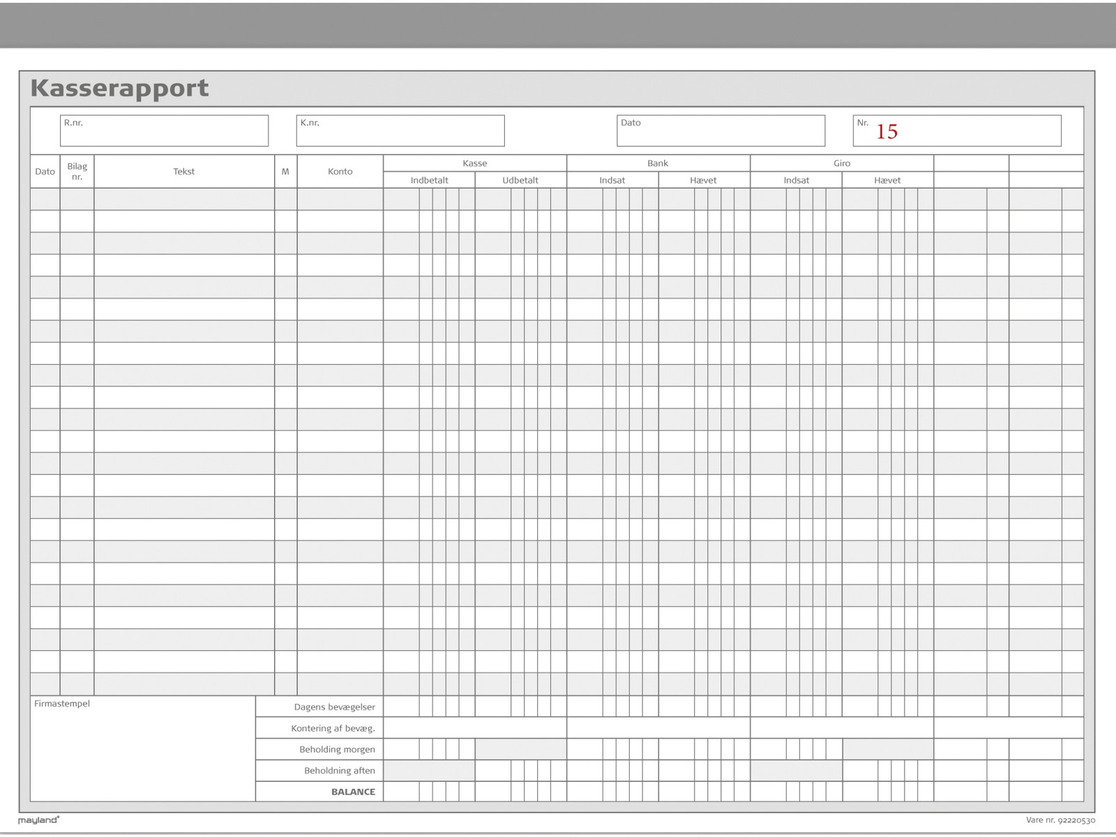 Kasserapport med kopi og fire kolonner: Kasse - Bank - Giro - Blank. Derudover plads til afstemning af dagens bevægelser.Nummereret fra 1-50.