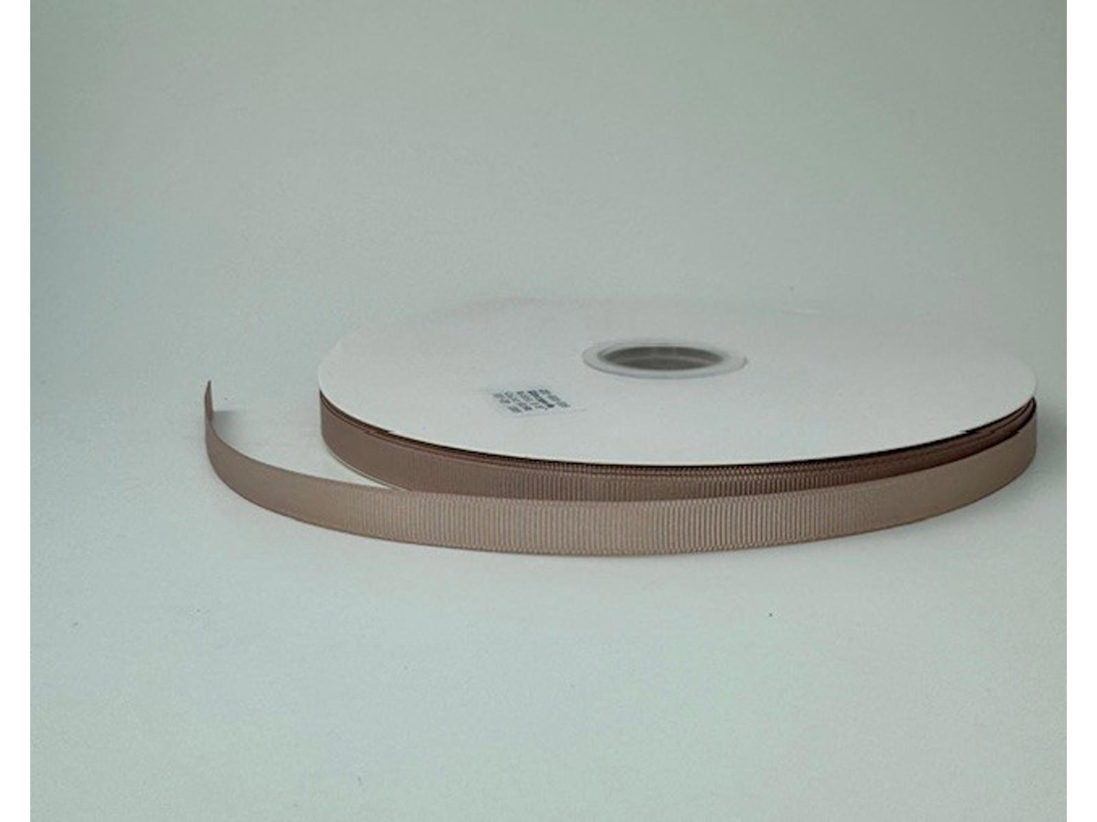 Rillet silkebånd i en flot lys nougatfarve. Silkebåndet er 9mm bredt, og der er 91 meter pr. rulle