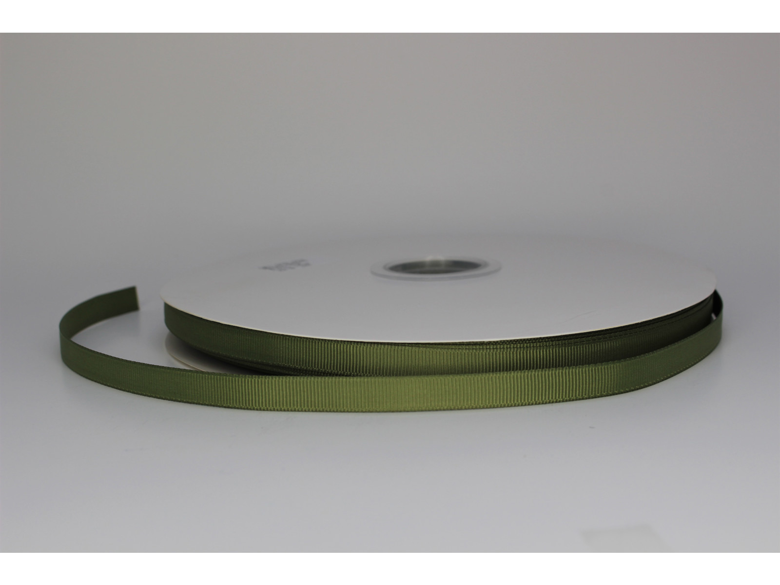 Flot oliven grønt silkebånd i eksklusiv rillet kvalitet. 9mm bredt x 91 meter pr. rulle
