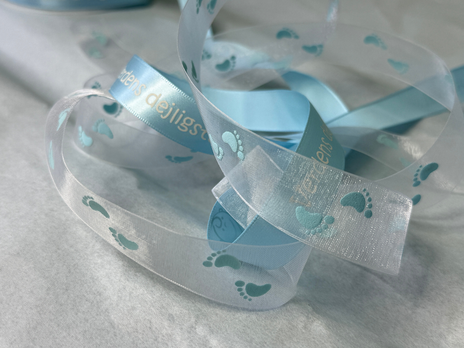 Det lyseblå babybånd er perfekt til indpakninge af barselsgaver eller barselsbuketter. Det kan også bruges til babyshower. Båndet er 16mm bredt og der er 20m pr. rulle. Teksten "Verdens dejligste dreng" er tryk med hvid på det lyseblå babybånd.