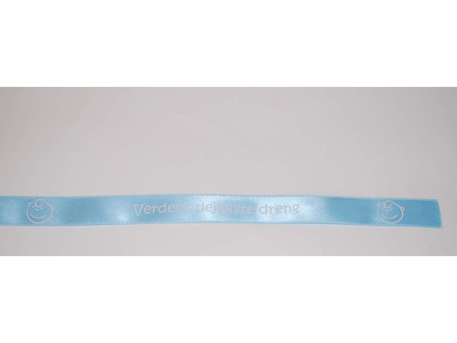 Det lyseblå babybånd er perfekt til indpakninge af barselsgaver eller barselsbuketter. Det kan også bruges til babyshower. Båndet er 16mm bredt og der er 20m pr. rulle. Teksten "Verdens dejligste dreng" er tryk med hvid på det lyseblå babybånd.