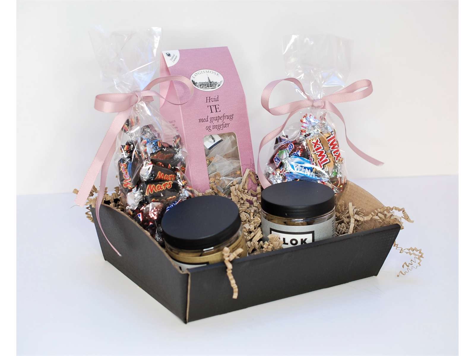 Sød lille sort gavebakke til værtindegaver, gavekurve med bolcher, hudplejeprodukter eller chokolade.
