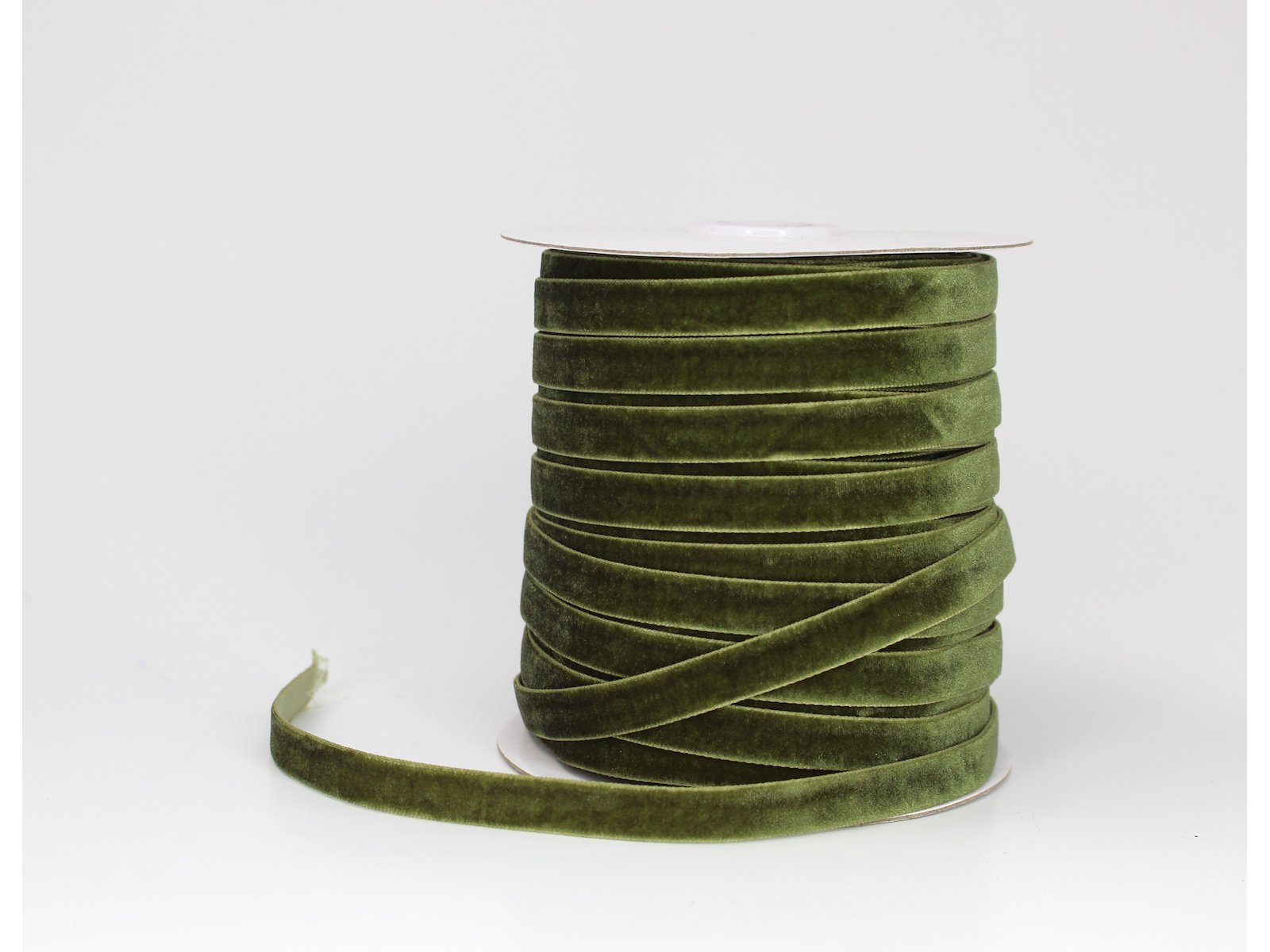 Flot og eksklusivt velourbånd i en flot mørk oliven farve. Bredd 9mm x længde 45m