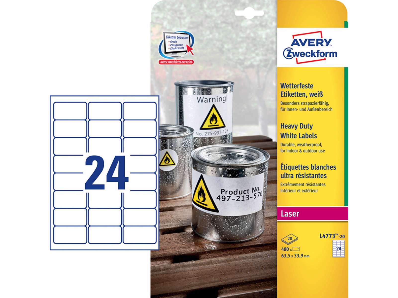 Extra durable labels - perfect for even outdoor use. The labels are particularly suitable for use in environments that place high demands on durability. They are suitable for marking PC equipment, fixtures, tools and products - or as stylish marking of brochures, folders and shelves etc. 24 pcs. per sheet. White. Polyester labels. Free of xylene, PVC, nickel and solvents. Waterproof and resistant to oil, dirt and UV rays. Application temperatures from -20gr to +80gr C.