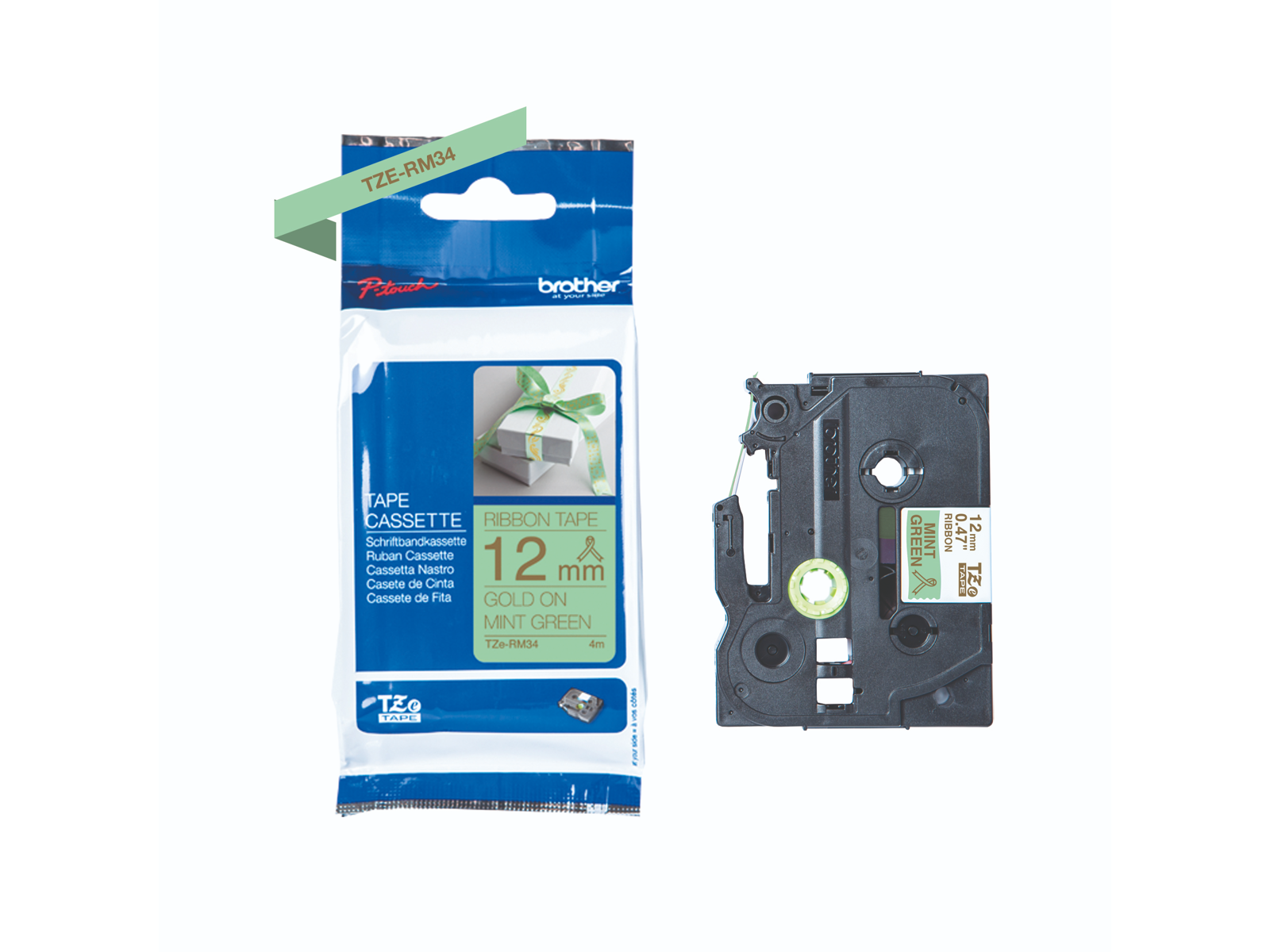 Brother TZe-RM34 printer gold text onå mint green 12mm satin ribbon, can be used as a gift ribbon