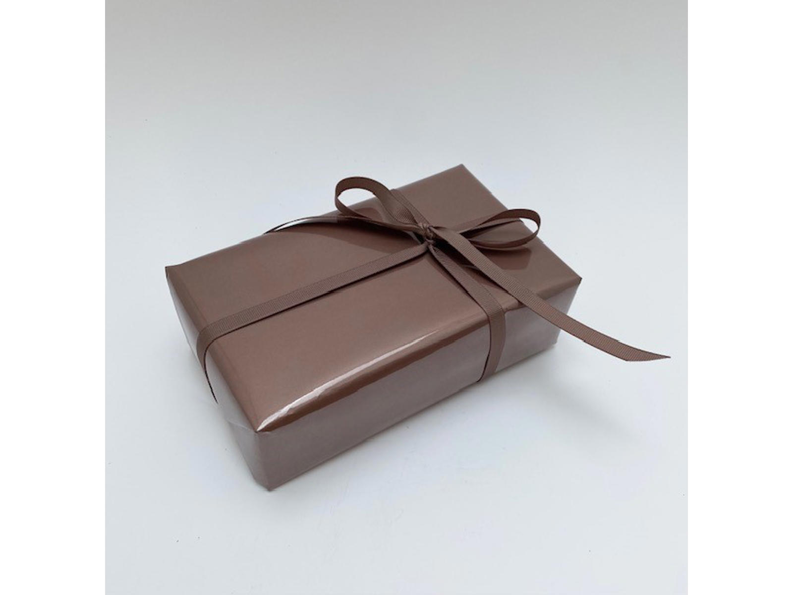 Shiny wrappingpaper in a brown metallic colour. 50cm x 180 meter per roll. This shiny paper gives your giftwrapping a beautiful finish