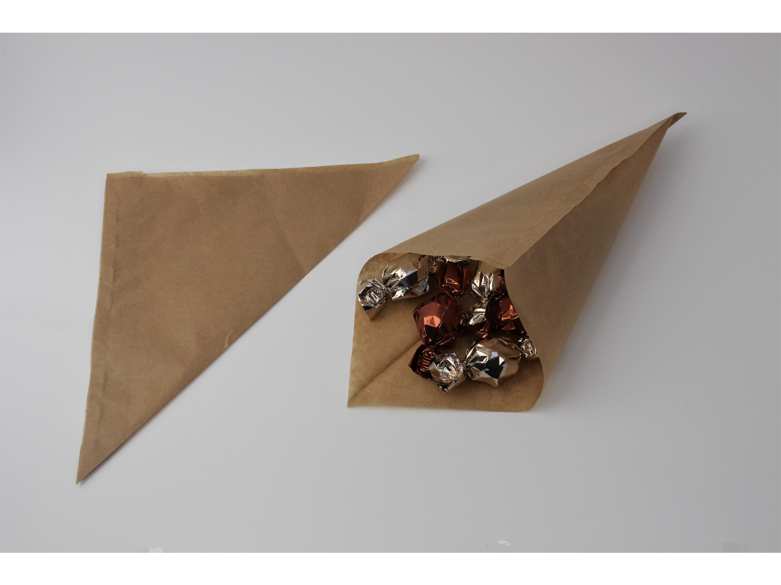 Pointed bags made of greaseproof brown paper. 23 x 23 x 32 cm open on one of the short sides. Suitable for roasted almonds