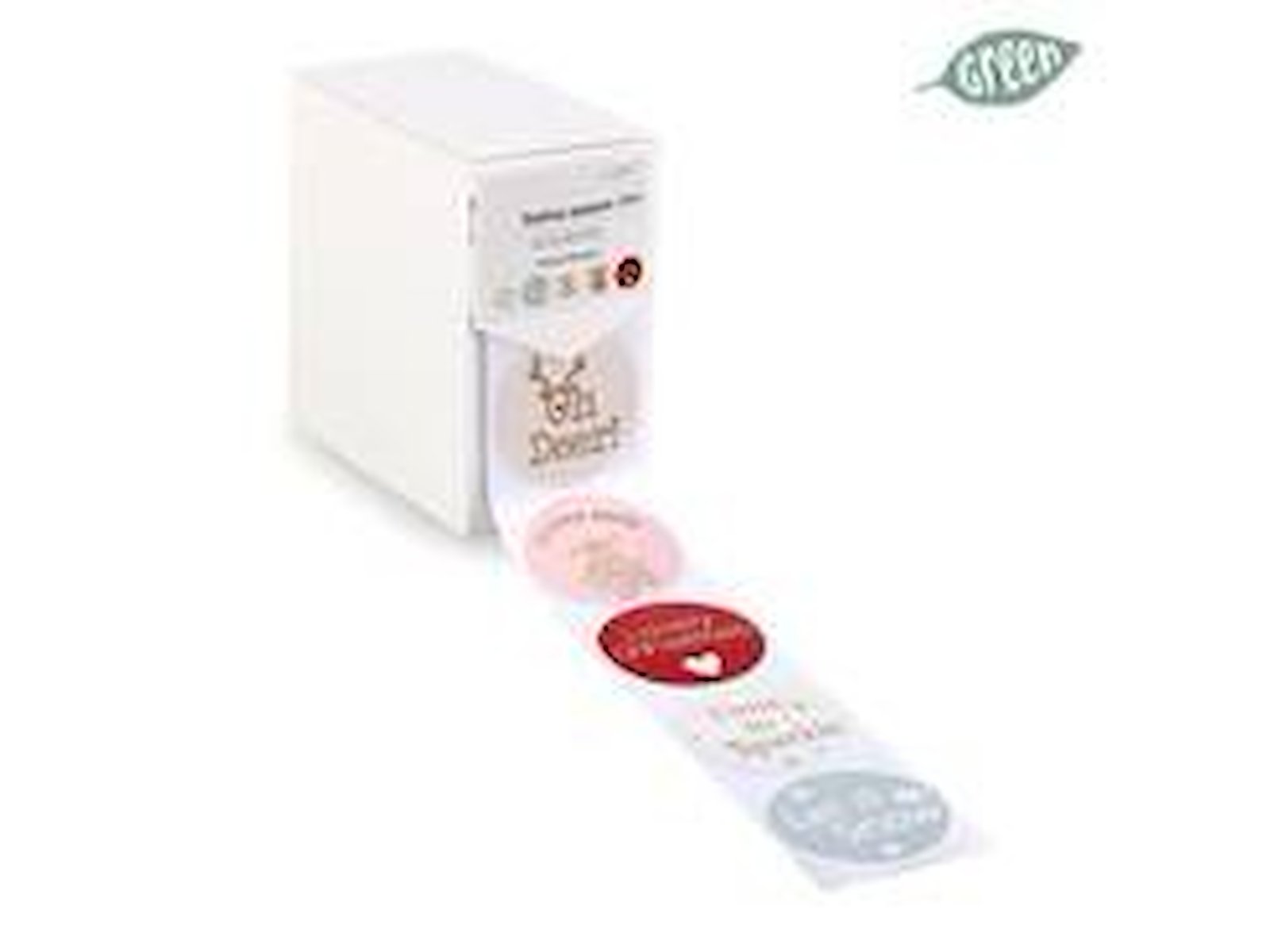 charming christmas stickers with the texts: "Time to Sparkle", Let it snow", Oh Deer", "Misteltoe kisses" og "Lovely Christmas". The stickers are 40mm in diameter and theres 500 stickers in a roll.