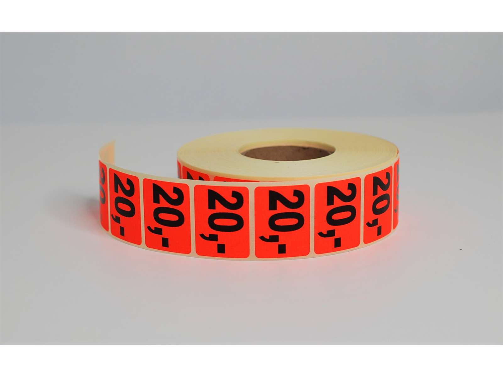 Pre-printed labels neon red NOK 20. 2000 pieces per roll.