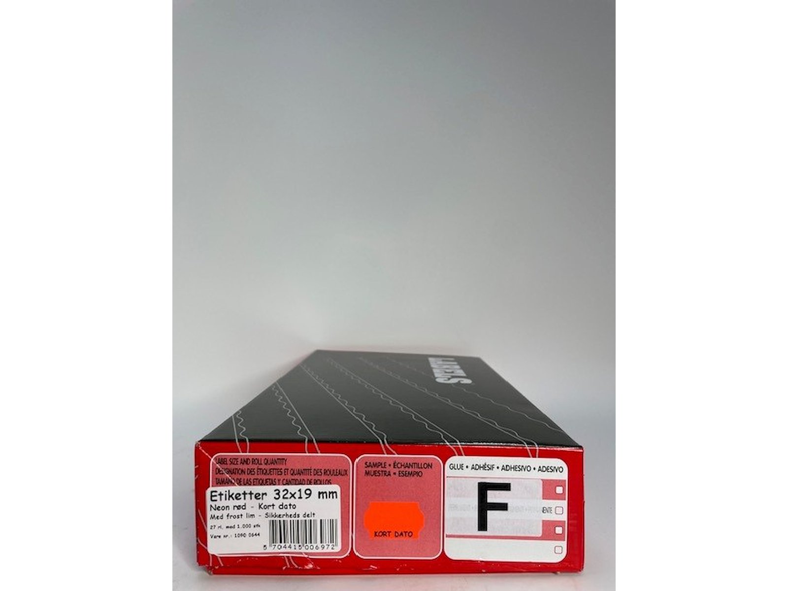 Etiketter 32x19 neon rød Kort Dato - sikkerheds delt - 27 rl. m/ 1.000 stk.
