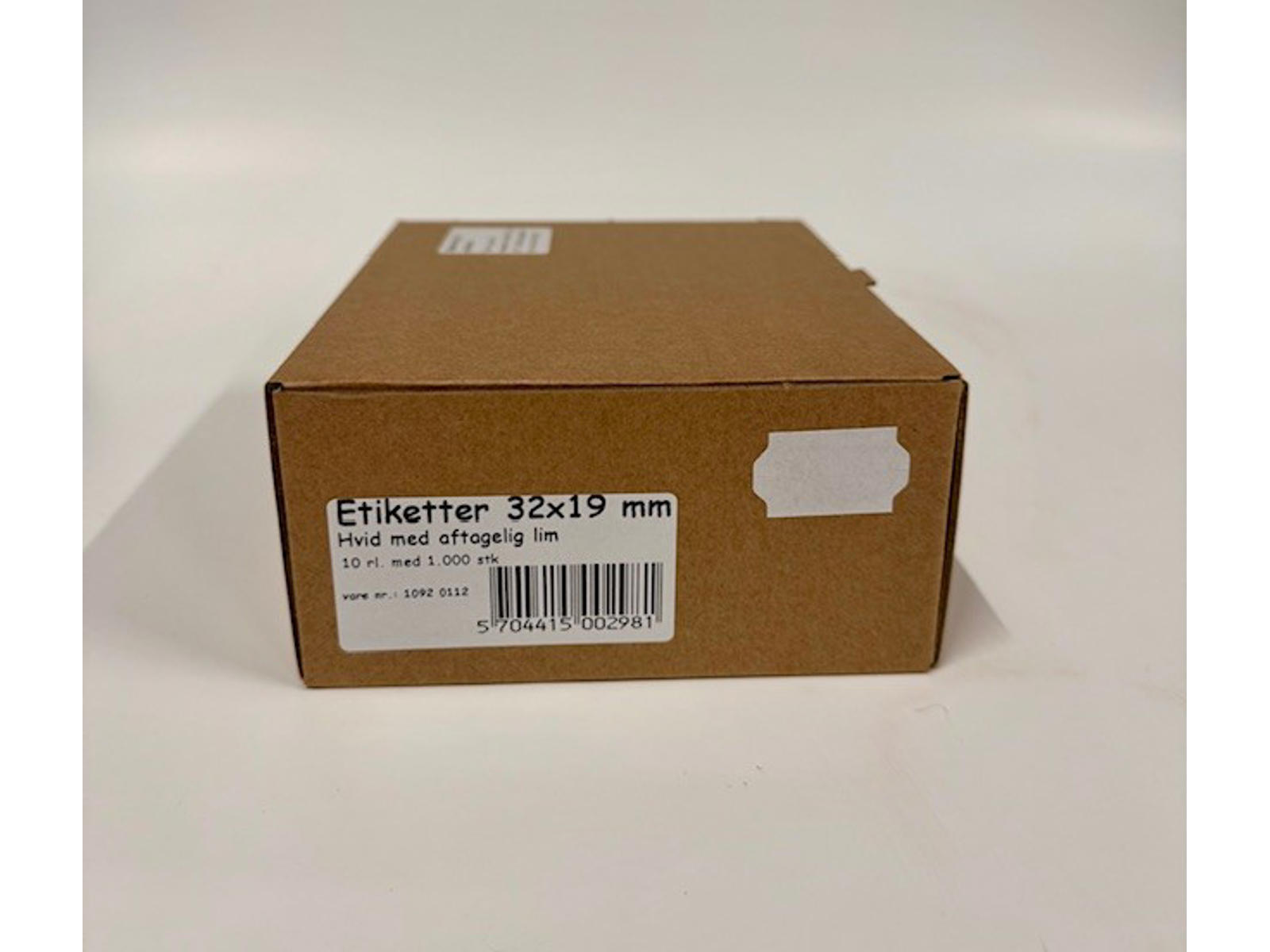 White labels 32x19mm with removable glue. 10 rolls of 1,000 labels in a box